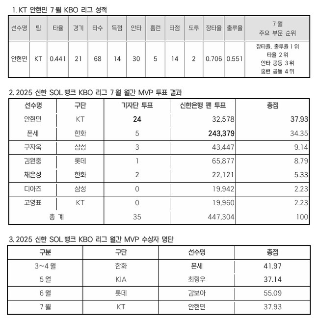 KT ¾ÈÇö¹ÎÀÌ 2025 ½ÅÇÑ SOL¹ðÅ© KBO ¸®±× 7¿ù ¿ù°£ MVP·Î ¼±Á¤µÆ´Ù. KT ¼±¼ö·Î´Â 2023½ÃÁð 8¿ù Äí¿¡¹Ù½º ÀÌÈÄ 2³â¿© ¸¸ÀÇ ¿ù°£ MVPÀ̸ç, ¾ß¼ö·Î´Â 2020½ÃÁð 6¿ù ·ÎÇϽº ÀÌÈÄ 5³â 1°³¿ù ¸¸ÀÌ´Ù.