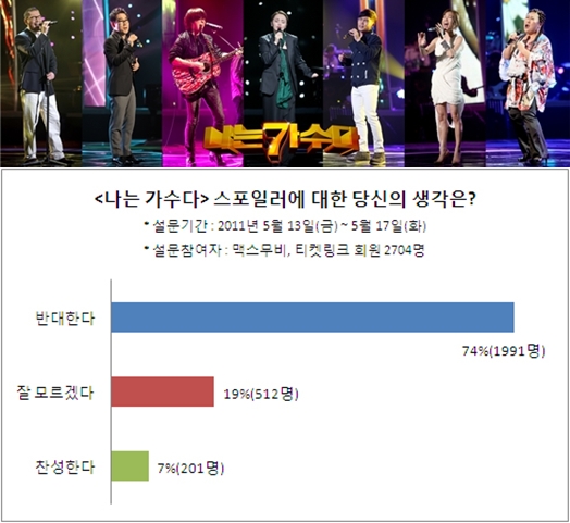 ¸Æ½º¹«ºñ¿Í ƼÄϸµÅ©´Â Áö³ 5¿ù 13ÀϺÎÅÍ 17ÀϱîÁö ´å»õ µ¿¾È 2,704¸íÀÇ ½Ç¸í ³×ƼÁðÀ» ´ë»óÀ¸·Î ¡°'³ª´Â °¡¼ö´Ù' ½ºÆ÷ÀÏ·¯¿¡ ´ëÇÑ ´ç½ÅÀÇ »ý°¢Àº?¡± À̶õ ¼³¹® Á¶»ç¸¦ ½Ç½ÃÇÑ °á°ú, ½ºÆ÷ÀÏ·¯¿¡ ¡®¹Ý´ëÇÑ´Ù¡¯´Â ÀÀ´äÀÚ°¡ 74%·Î °¡Àå ¸¹¾Ò´Ù.