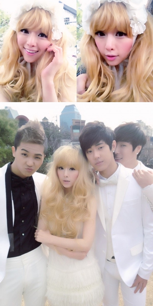 °ø°³µÈ »çÁøÀº ±Ý¹ß¸Ó¸®·Î º¯½ÅÇÑ È«¼ö¾Æ°¡ µ¿·á ³²ÀÚ¹è¿ìµé°ú ³ª¶õÈ÷ ¼ÀÖ´Â ¸ð½ÀÀ» ´ã°í ÀÖ´Ù. ±ä ¿þÀÌºê ¸Ó¸®¿¡ ¼ø¹é»ö ¿þµùµå·¹½º¸¦ Â÷·ÁÀÔ°í ÀÖ´Â È«¼ö¾Æ°¡ ¹ÙºñÀÎÇüÀ» ¿¬»óÄÉ Çß´Ù.