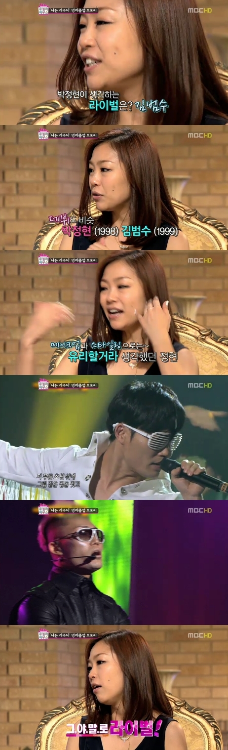 ¹ÚÁ¤ÇöÀº 7¿ù 12ÀÏ ¹æ¼ÛµÈ MBC ¡®ÁÖ¾ó¸®ÇϿ콺¡¯¿¡¼ 'ÀϹã-³ª´Â°¡¼ö´Ù' ´ç½Ã ¶óÀ̹ú·Î ±è¹ü¼ö¸¦ ²Å¾Ò´Ù.