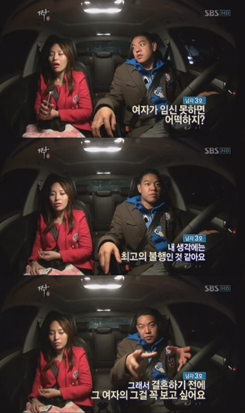 ¦ ³²ÀÚ3È£´Â 11¿ù28ÀÏ ¹æ¼ÛµÈ SBS '¦' ¾ÖÁ¤ÃÌ 40±â¿¡¼ ¸¶À½¿¡ µÐ ¿©ÀÚ6È£¿Í µå¶óÀ̺긦 Áñ°å´Ù. ³²ÀÚ3È£´Â "³ °áÈ¥ Àü µÎ·Á¿î °Ô Çϳª ÀÖ´Ù. ¿©ÀÚ°¡ ÀӽЏøÇÏ¸é ¾î¼³ª ÇÑ´Ù. ±×°Ô ³» »ý°¢¿£ ÃÖ°íÀÇ ºÒÇàÀÎ °Í °°´Ù. ±×·¡¼ °áÈ¥Çϱâ Àü¿¡ ±× ¿©ÀÚÀÇ ±×°É ²À º¸°í½Í´Ù"°í ¸»Çß´Ù.